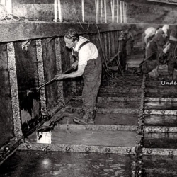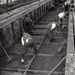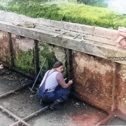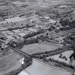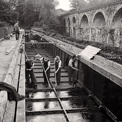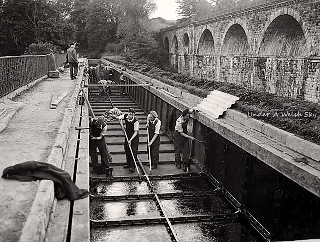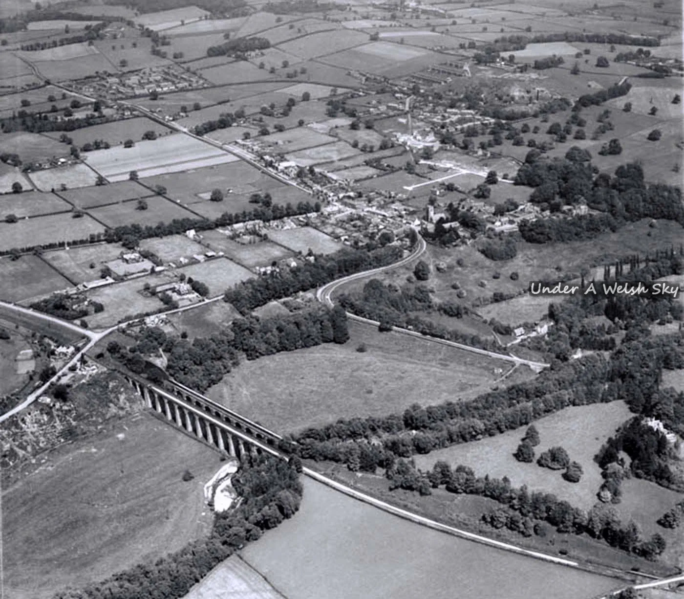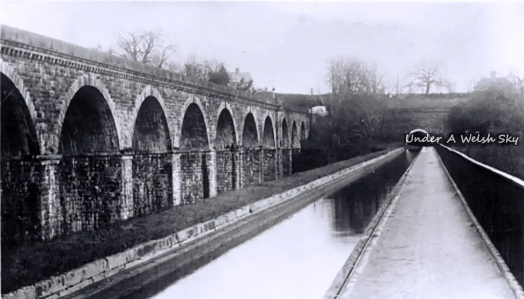 The 10-arch Chirk aqueduct carries the Llangollen Canal over the Ceiriog Valley. It opened in 1801, when boats began to transport goods from the basin at the north end. The canal was extended to Froncysyllte the following year. Alongside Chirk aqueduct stands the 16-arch viaduct of the Shrewsbury & Chester Railway, opened in 1848, engineered by Henry Robertson.