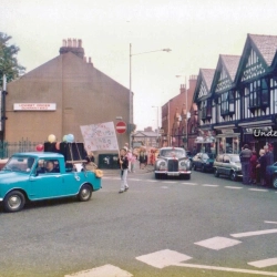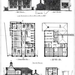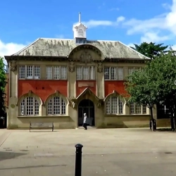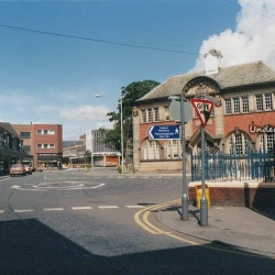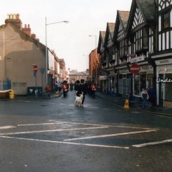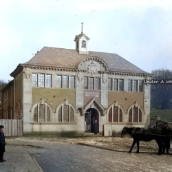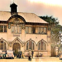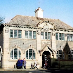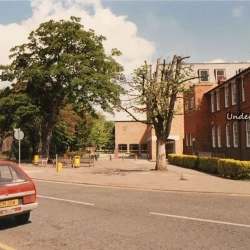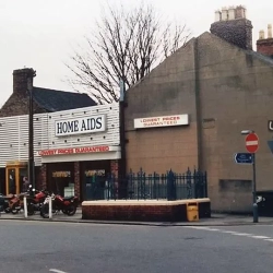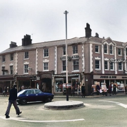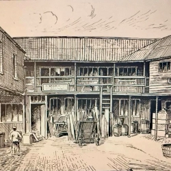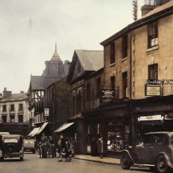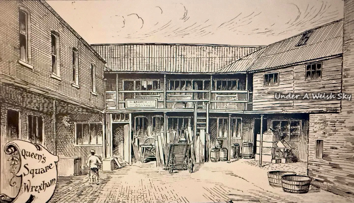 A notable historic building on this street was Queen’s Square, erected in 1804, one of the market squares which used to be occupied by tradesmen from various parts of England during the great March Fair. It was approached from Queen Street through a pair of iron gates and under, a covered entrance to an open square, surrounded on two sides (probably on three sides originally), with a covered gallery supported by pillars. In this gallery and beneath, on the ground floor, were shops. Calico and table linen were the principal articles sold.